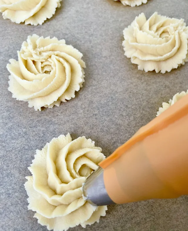 Перекладіть тісто в кондитерський мішок з насадкою. Рекомендую взяти якомога міцніший мішок, тому що тісто доволі щільне, щоб він не прорвався (перший, який я взяла, саме так і зробив 😄). Відсадіть печиво на пергамент.
