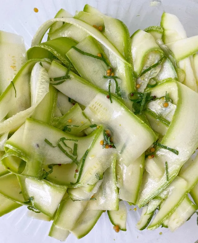 Наріжте дрібно листочки мʼяти і додайте до нарізаних кабачків. Вилийте туди ж заправку, гарно розмішайте і дайте їм постояти хвилин 5-10.