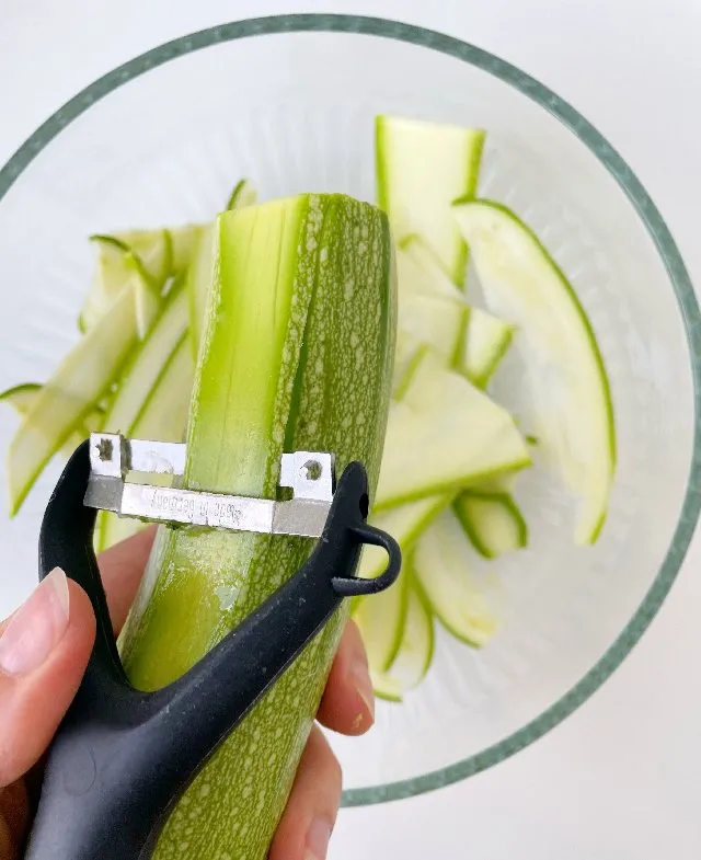 Кабачки нарізати на довгі тоненькі слайси на спеціальній насадці тертки або овочечисткою. Важливо отримати саме ось такі тоненькі смужечки, вони гарно промаринуються і будуть дуже ніжними за текстурою.