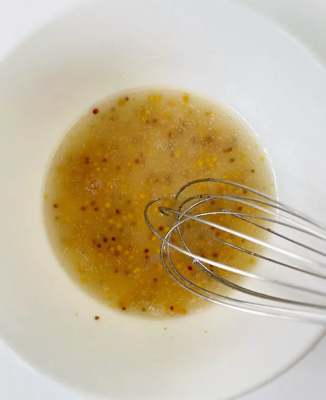 Приготуємо заправку. Для цього в мисочці змішайте до однорідної емульсії олію, лимонний сік, гірчицю та мед. Щодо солі. Я тут її не використовую, мені вистачає солоності сиру, але якщо ви любите солоніший смак — додайте до соусу дрібку солі.